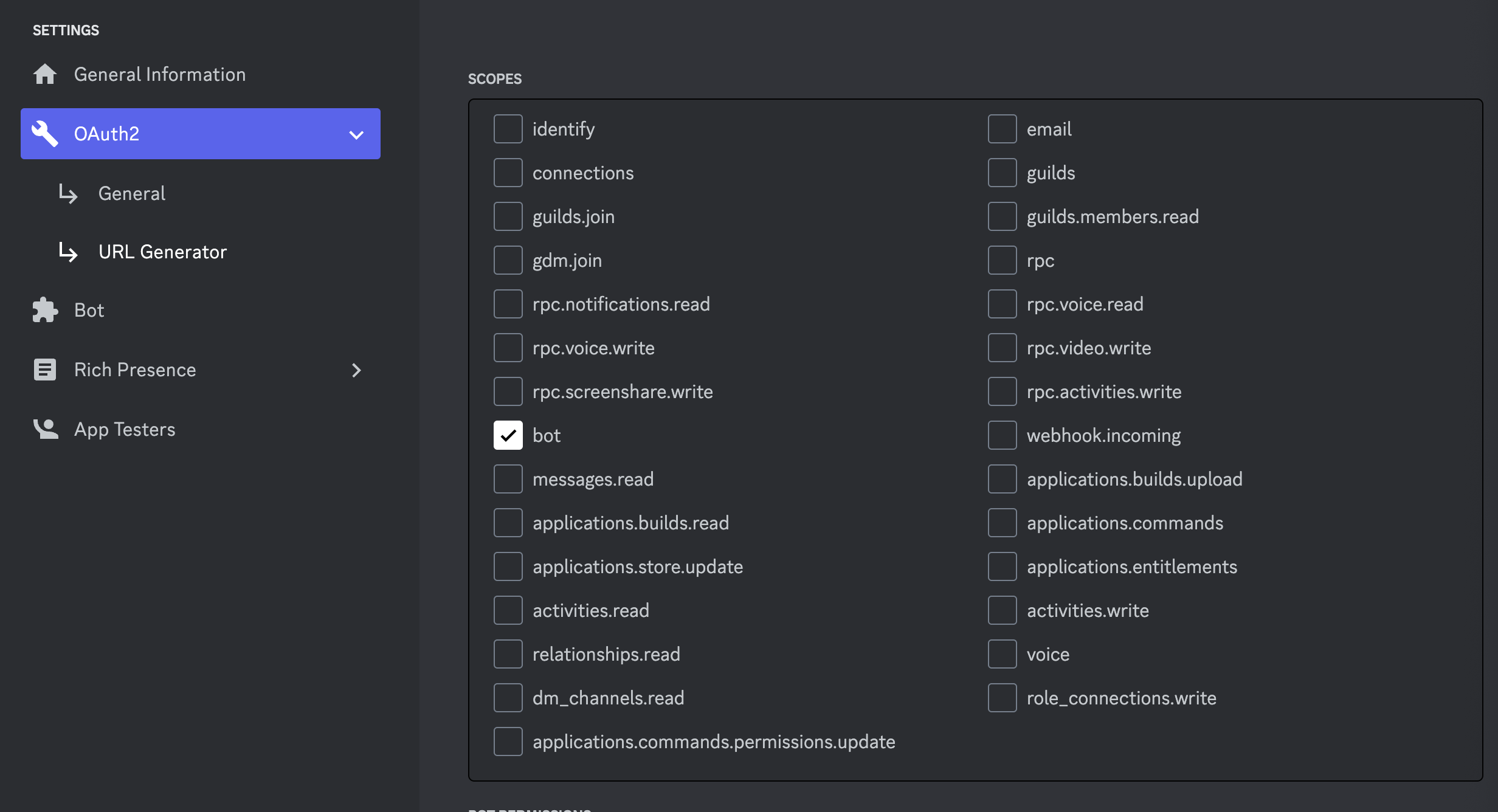 초대할 앱의 설정 - OAuth2 - URL Generator 메뉴에서 bot을 선택합니다. 개발할 bot에 필요한 기능들을 체크하고, 화면 하단에 보이는 GENERATED URL을 복사해서 브라우저에서 실행합니다. 그러면 봇을 초대할 디스코드 서버를 선택할 수 있습니다.