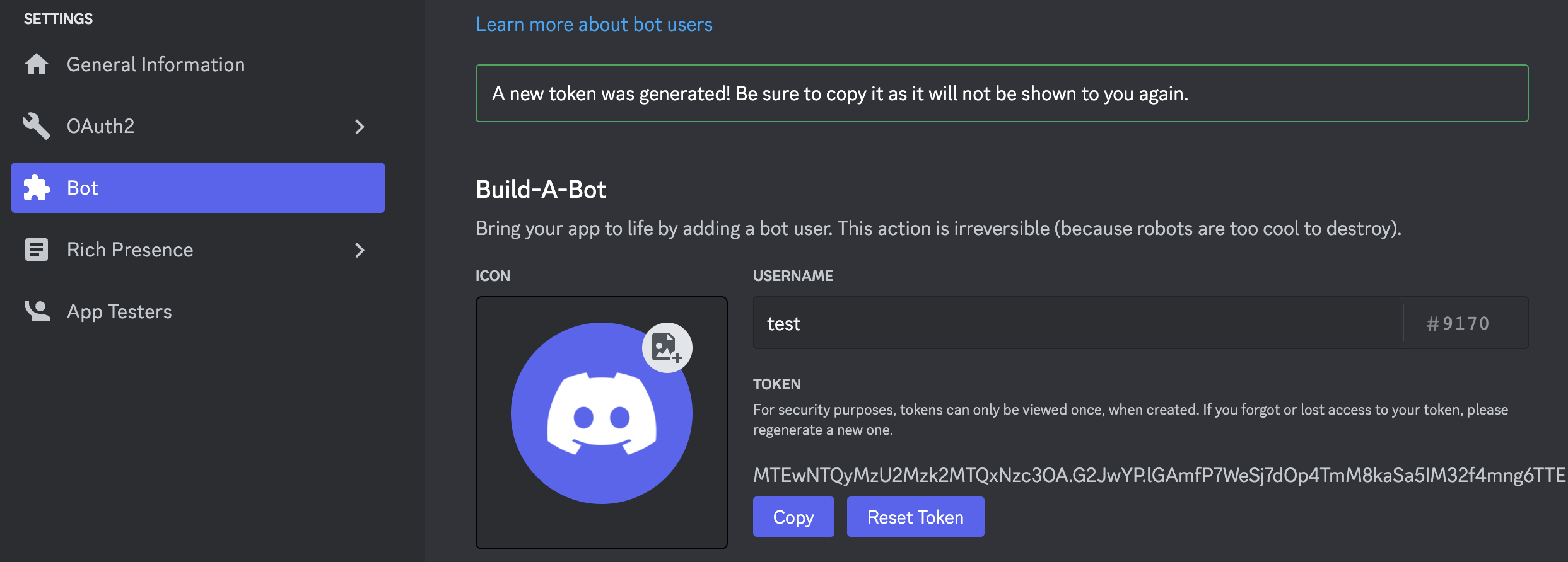 디스코드 봇을 개발하기 위해서는 우선 디스코드 개발자 포탈에 가입해서 애플리케이션(봇)을 만들고, 해당 애플리케이션의 토큰을 발급받아야 합니다. 아래의 사진과 같이, 해당 앱의 설정 - 봇 메뉴에서 Reset Token을 실행해서 토큰을 얻습니다. 이 토큰은 공유하지 마시고 노출되었다면 Reset Token으로 갱신해 주세요.